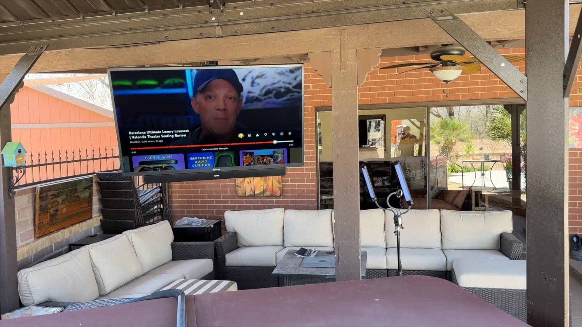 If your patio has overhead beams or a pergola, ceiling mounting can feel more natural than taking up wall space. It keeps the layout open and gives you flexible viewing angles.