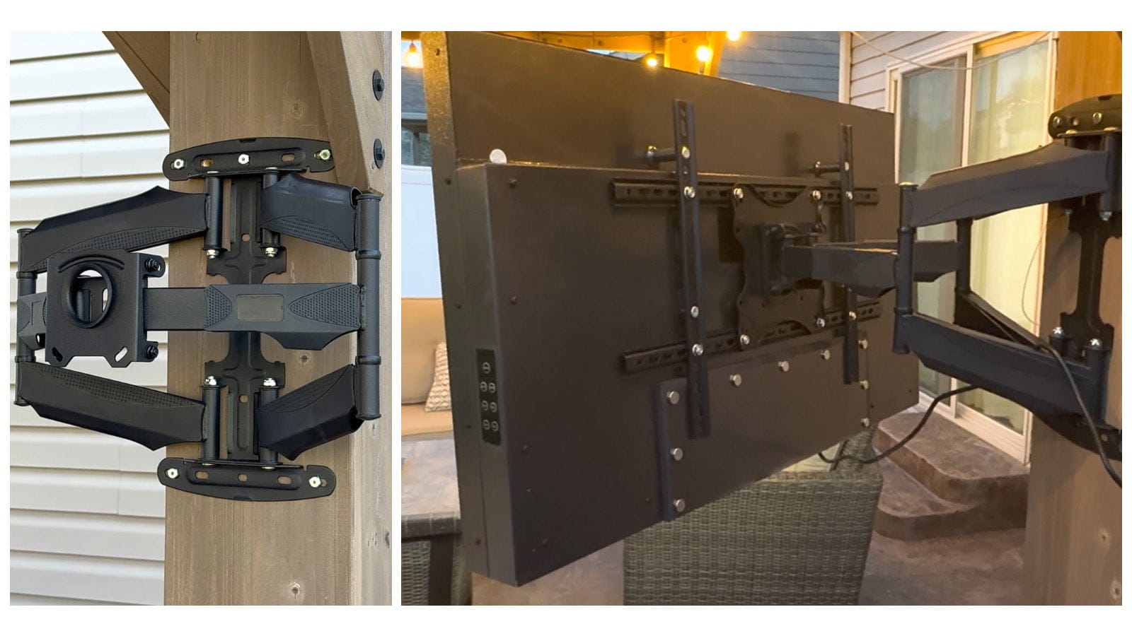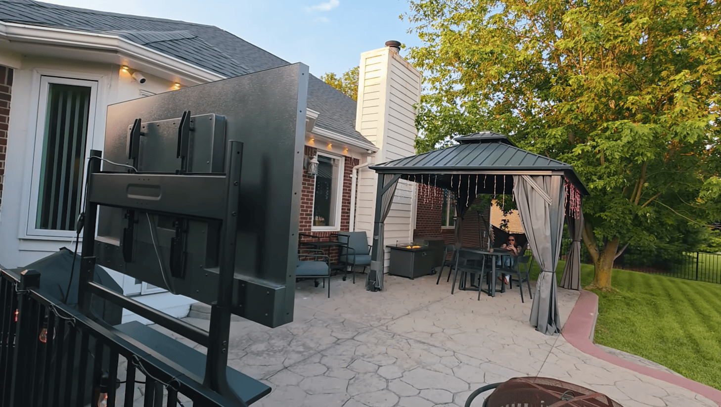 Another way to mount an outdoor TV without drilling is to use a weatherproof outdoor TV lift cabinet, which supports the TV internally while keeping it protected when not in use.
