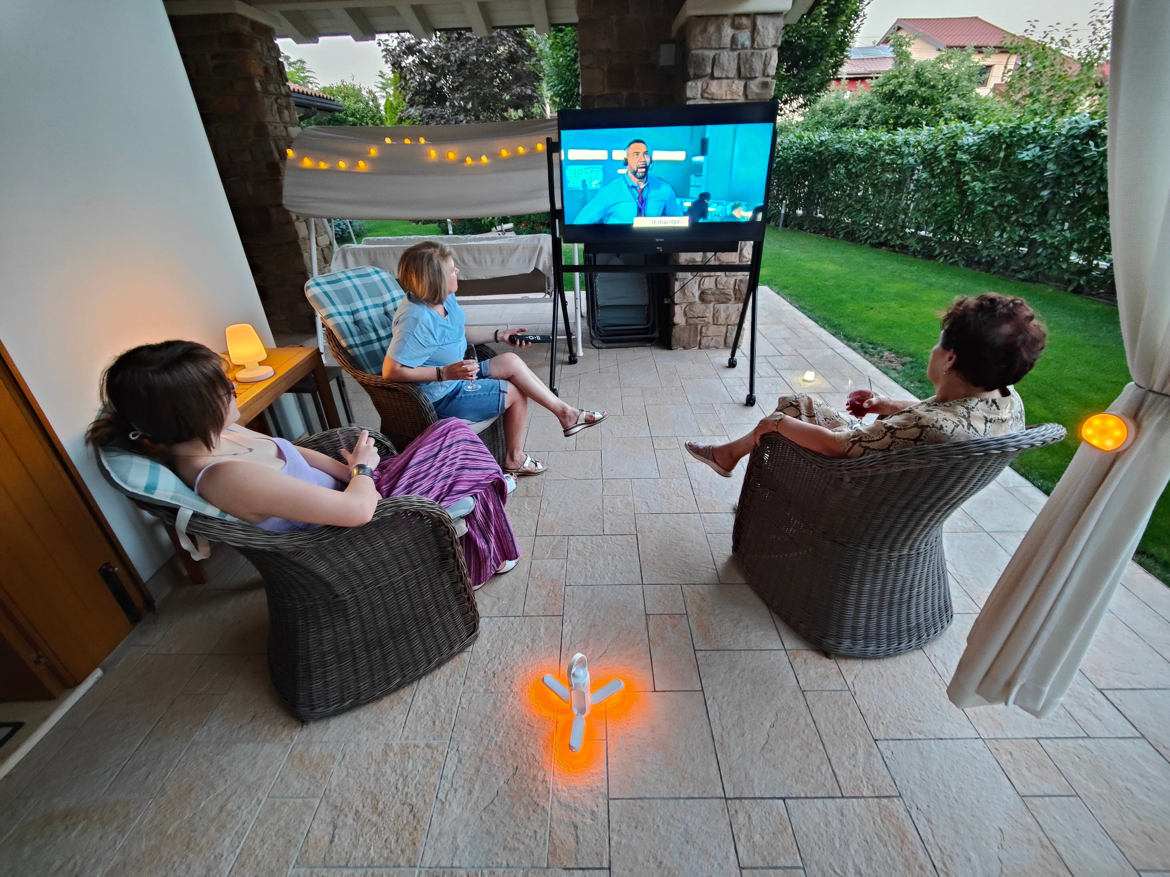Start simple. A DIY outdoor man cave equipment setup can include a Sylvox outdoor TV, portable seating, and string lights.