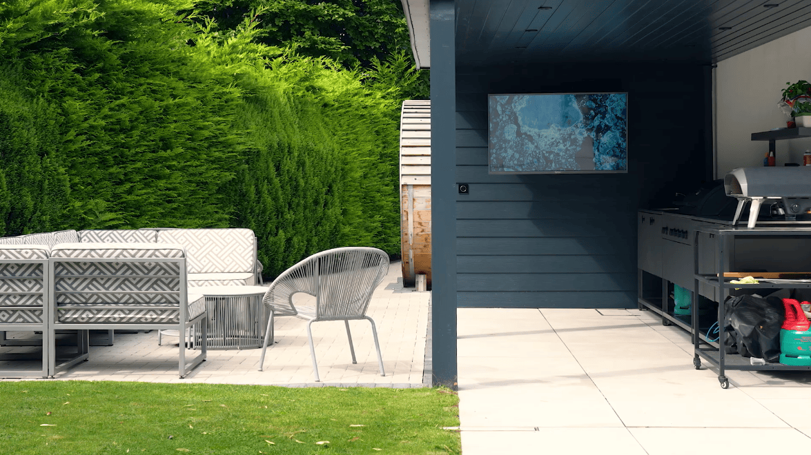 To create a backyard entertainment area, start by placing an outdoor TV where it naturally becomes the focal point of the space—ideally visible from seating, the grill area, and nearby lounge spots. A high-refresh-rate outdoor TV for gaming or sports can easily anchor a backyard entertainment system, turning the patio into a place for watching games, playing console matches, or relaxing outdoors.