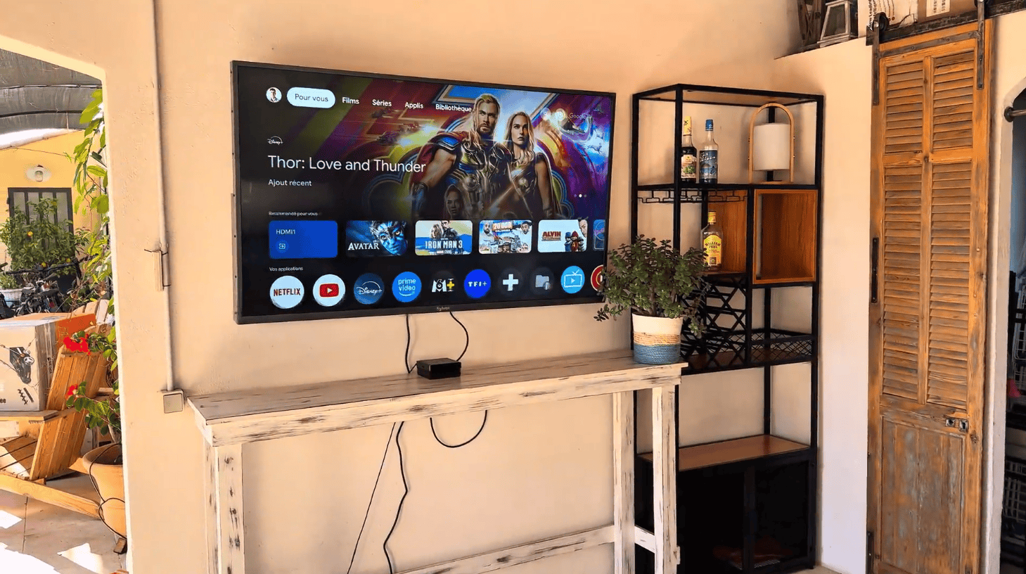 Mount the outdoor TV on a shaded wall or hang it from a beam or pergola structure.