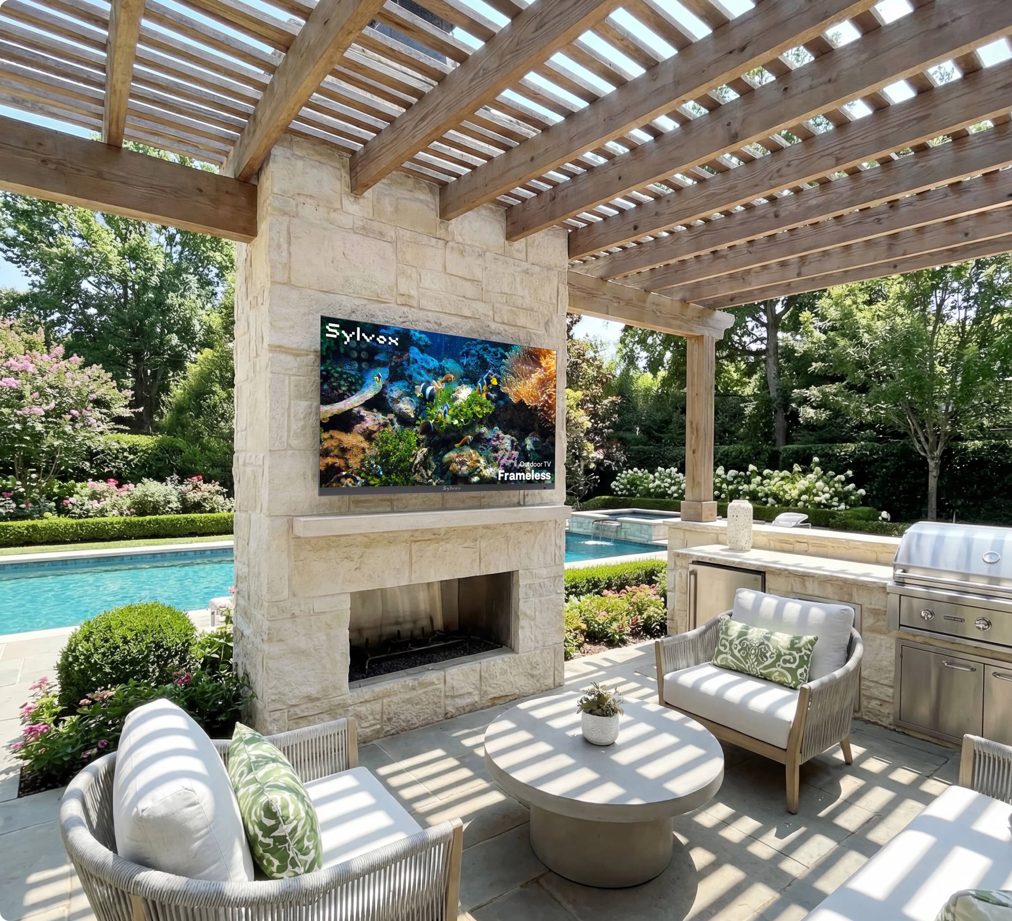 This is where design-led outdoor TVs make a meaningful difference. The Sylvox Frameless Series and Frameless Pro Series introduce the world's first frameless outdoor TV design, reducing visible borders so the screen recedes quietly into its surroundings. By minimizing visual boundaries, the display blends more naturally with architectural lines, open views, and landscape elements—supporting outdoor spaces built around simplicity and balance.