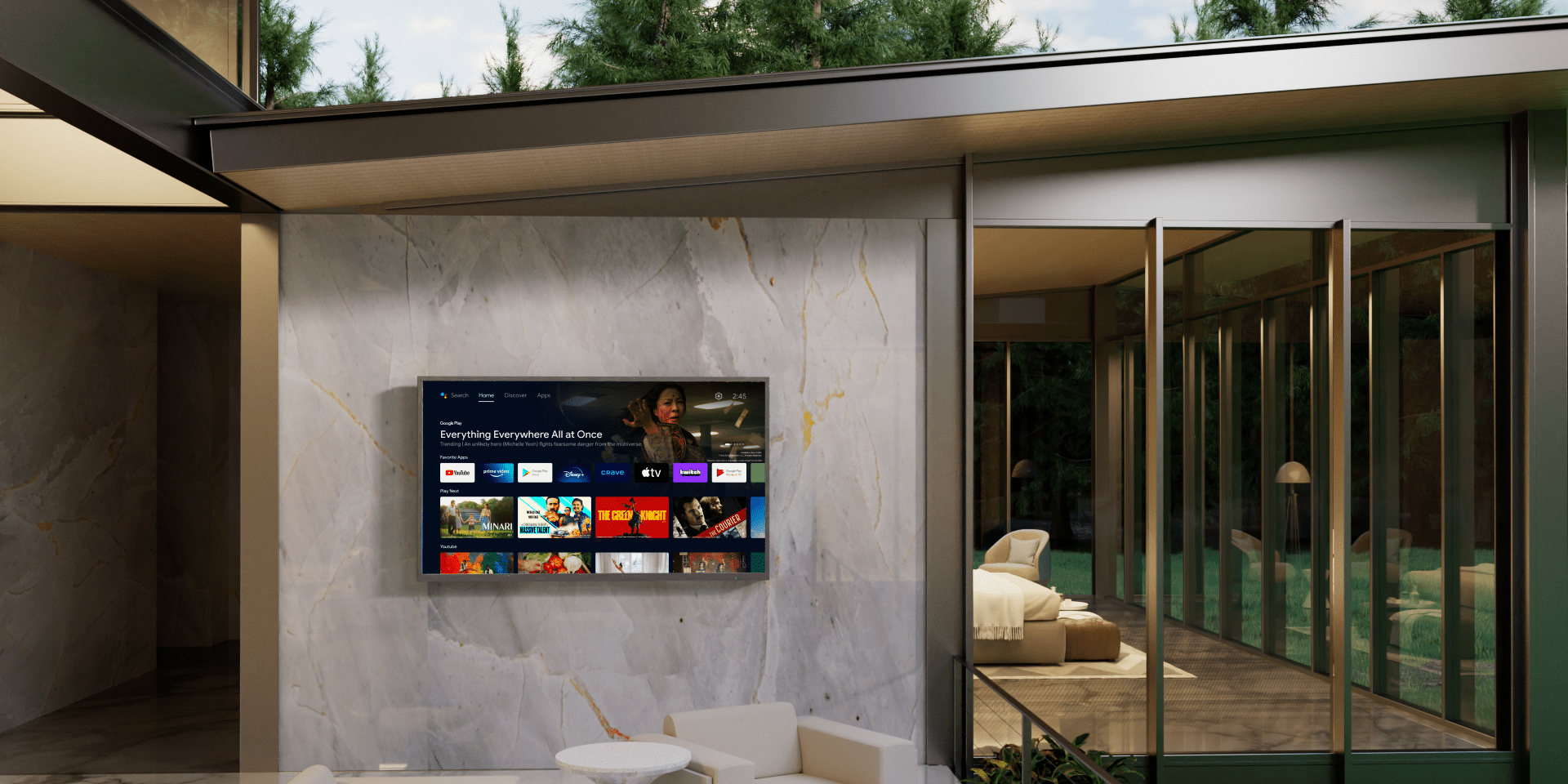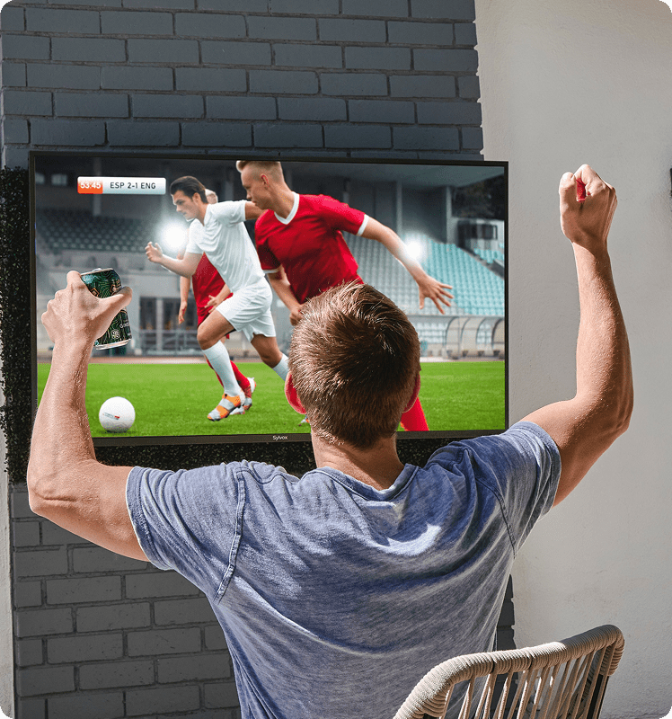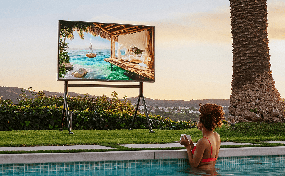 A next-level outdoor TV designed to perform in sunlight, rain, or snow.