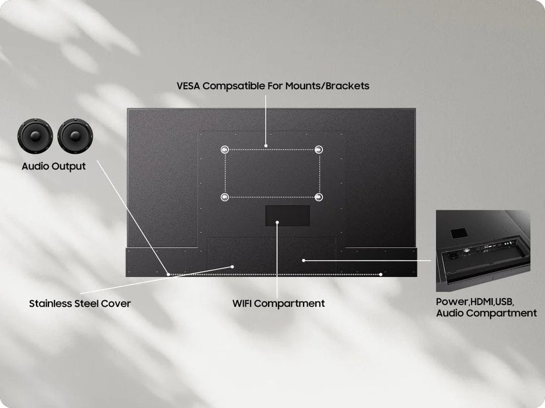Mount it. Plug it in. Enjoy. Designed for convenience, the Deck Pro Qled 2.0 is compatible with standard VESA mounts, making it easy to install on walls, stands, or outdoor enclosures.